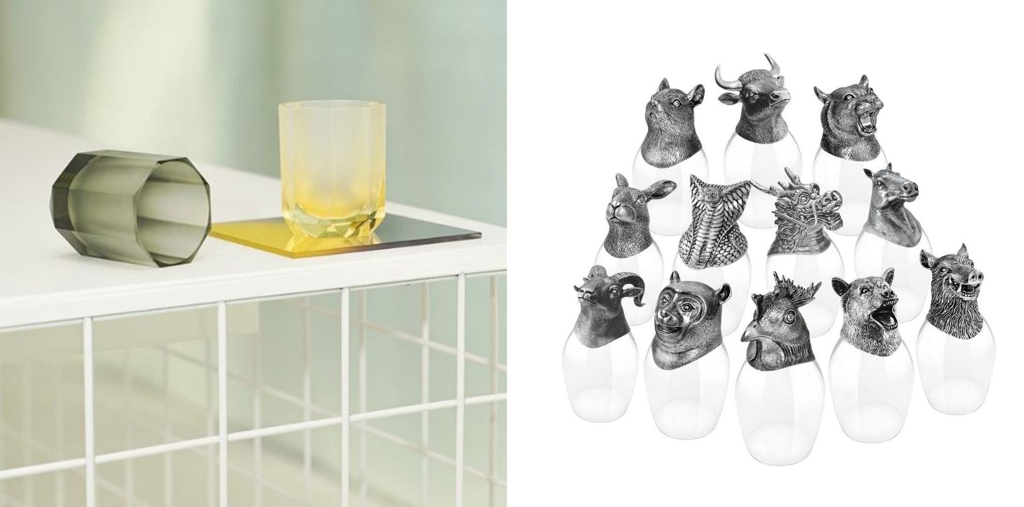 From left to right: The Moonshadow Glass & Coaster Set by Let’s Talk Glass and the Chinese Zodiac Wine Glasses (Set of 12) by 5IVE SIS.