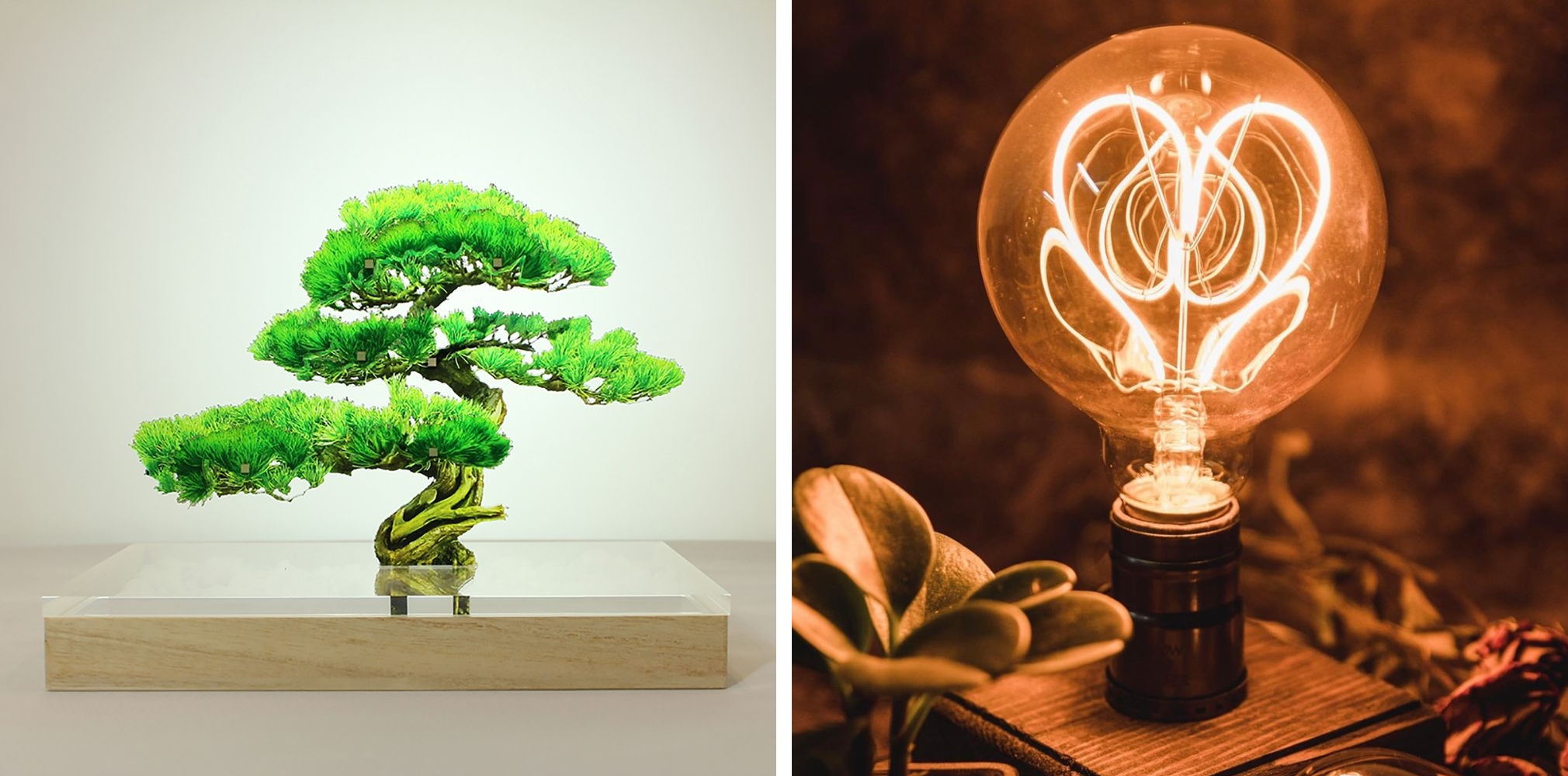 From left to right: The Bonsai (Pine Tree Green) by toumei and the Vintage-Style Wooden Table Lamp by The Eighteen Studio.