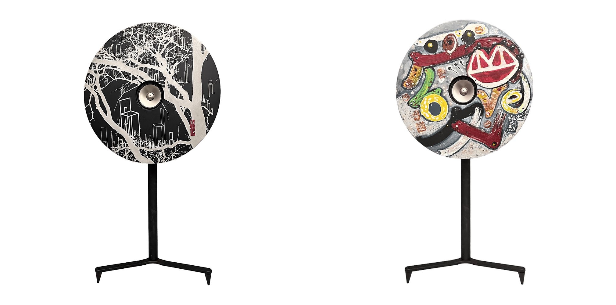 From left to right: The limited-edition ‘Symbiosis’ and ‘Metaverse Love’ Speakers created by DBA in collaboration with Freeman Lau and Frog King Kwok respectively.